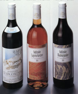 Vielfältig und interessant ist das Angebot seines Gebietes an Rotweinen. Vom jugendlich-frischen Lagrein Kretzer, über den fruchtigen Vernatsch zum angenehmen St. Magdalener. Außerdem führt Thomas Mayr noch einen eleganten Blauburgunder und den fülligen Lagrein Dunkel. Ein natürlicher Ausbau bringt die besonderen Eigenschaften der Traubensorten richtig zur Geltung. So könnt Ihr Euch zu jedem Anlaß von seinen Rotweinen verwöhnen lassen. |