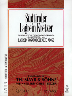 Südtiroler Lagrein KretzerDieser Wein wird aus der roten Lagrein-Traube gewonnen, Dadurch enthält der Wein wenig Gerbstoffe, aber dafür ein eigenes Aroma und einen interessanten Farbton. |